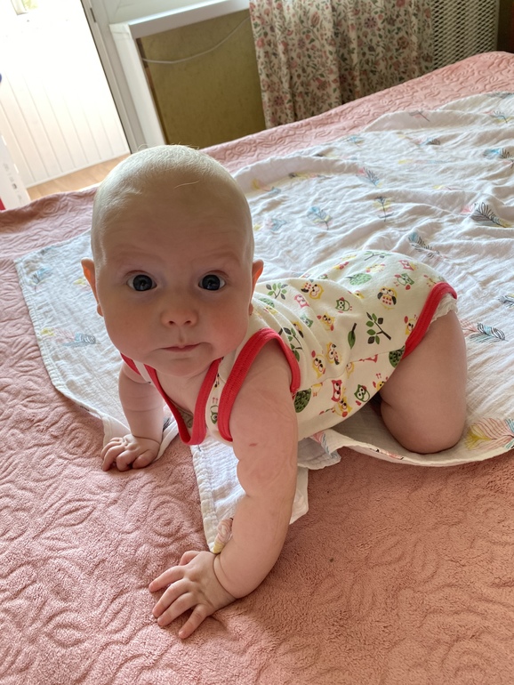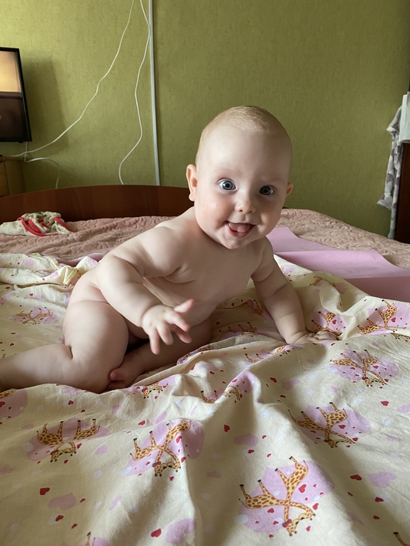 За этот месяц освоила ползание по пластунски, особенно мотивируют ее пульты и телефоны) ползает быстро, крутится в разные стороны, перевороты давно уже и со спины на живот, и обратно. В 5 мес и 3 нед начала садится на полупопие)) что не день, то что то новенькое))