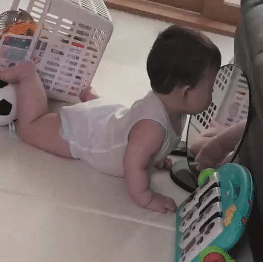 Мой всегда стесняется зеркала первые минуты а потом играет с ним. Думает что там другой ребёнок, как на детской площадке.