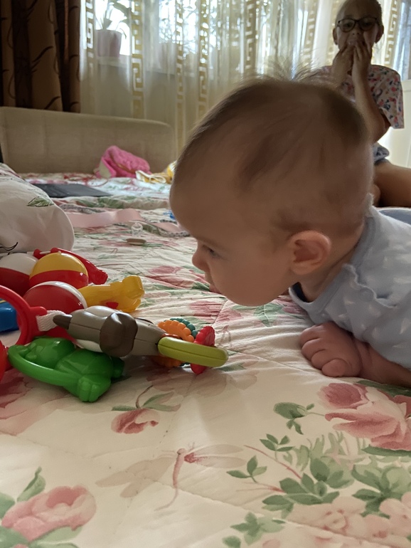 Ещё когда подношу к кровати животом вниз голова уже торчком, лежит смотрит, и таким удивленным взглядом, мол - ого, оказывается так тоже можно было)) и уже к ночи ближе кода укладывала спать на своей груди (мы спим живот к животу) просто сам поднял голову и заглядывал в мои глаза 🙄