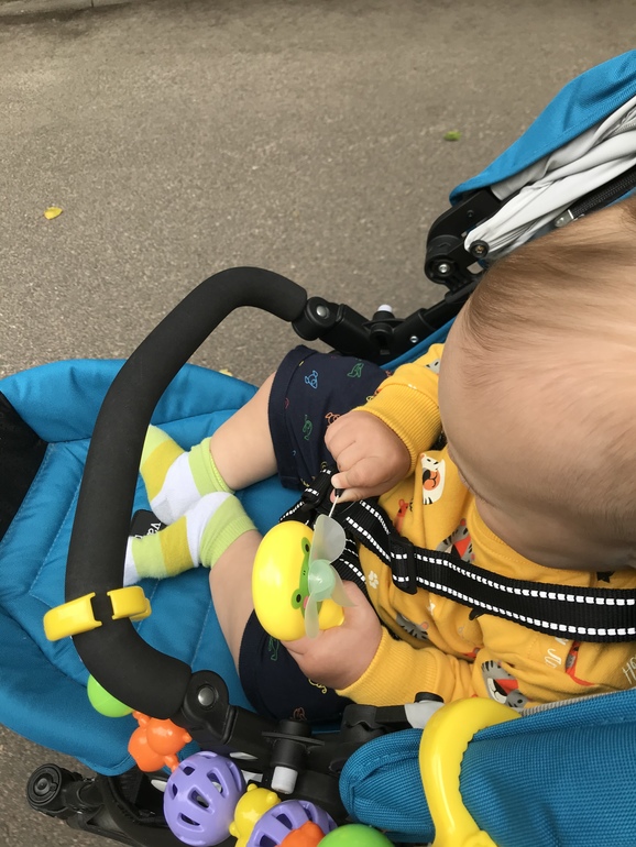 Вторая любимая игрушка - упаковка с мыльными пузырями с вентилятором. Та-дам! Это была главная супер-развивающая игрушка этого месяца 😂 тут и восторг от больших мыльных пузырей, и держать в руках удобно пока сидишь в коляске, и лопасти грызть, и колечко пальцем оттягивать и запускать вентилятор. Стоимость игрушки - 80 рублей, куплена просто так в дорогу, а оказалось хитом. Вот так иногда бывает 😄