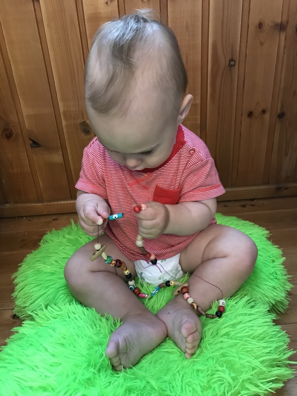 И мячики. В них он может играть долго сам с собой - подползает, толкает, ползёт за ним снова и так довольно долго.