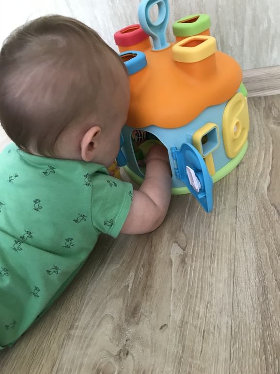 Домик-сортер Smoby. В первый день когда я его достала, то восторг вызвали дверцы - вау, открываются и закрываются! а потом уже и с фигурками стал играть. Вообще домик гениальный, тут и фигуры животных (да такие что не проглотит годовасик), и яркие цвета, и крепкая качественная пластмасса, и двери и ключики. Илья активно играет с ним сам - открывает и закрывает дверцы, пытается пропихнуть ключи в отверстия для фигур, грызёт и таскает туда сюда фигурки животных, если их накидать внутрь домика то через открытую дверь просовывает руку и достаёт их наружу.