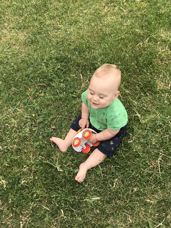 Отлично ходит вдоль опоры. Но я про это пишу каждый месяц, никакого дальнейшего прогресса пока нет: ходит и стоит возле опоры, сидит, ползает. Пока даже не пытается учиться вставать из позы сидя или делать шаги от опоры.