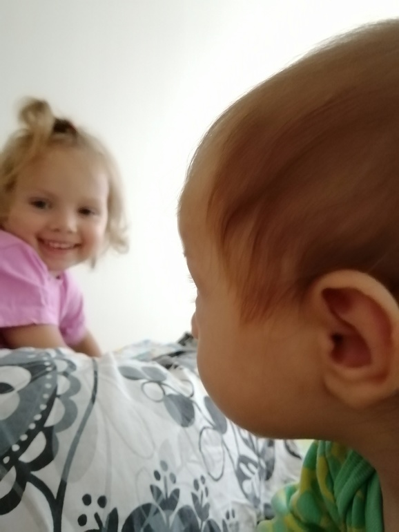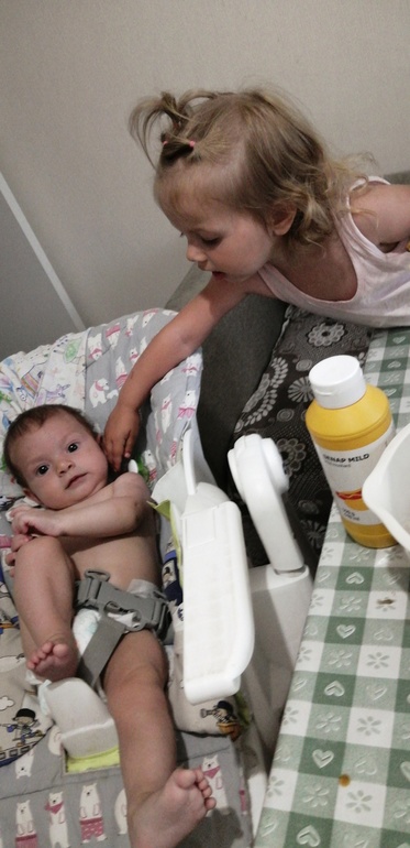 С Валей уже начались разборки) Ну точнее Катя хочет с ней общаться, а Валя аккуратно отпихивает Катины руки и затыкает ей рот пустышкой.