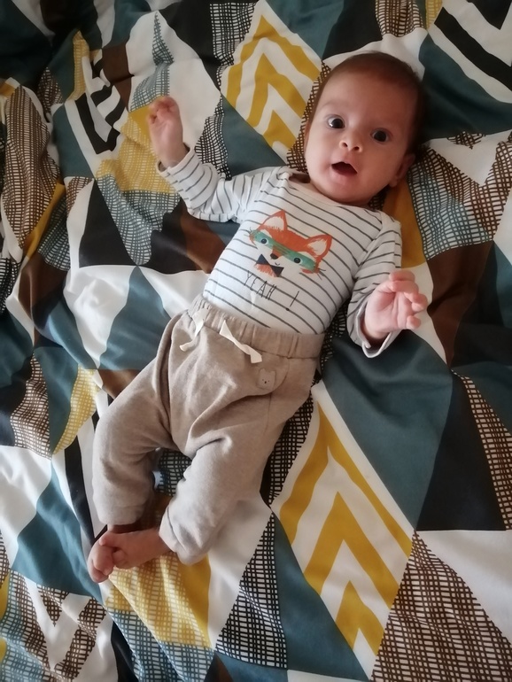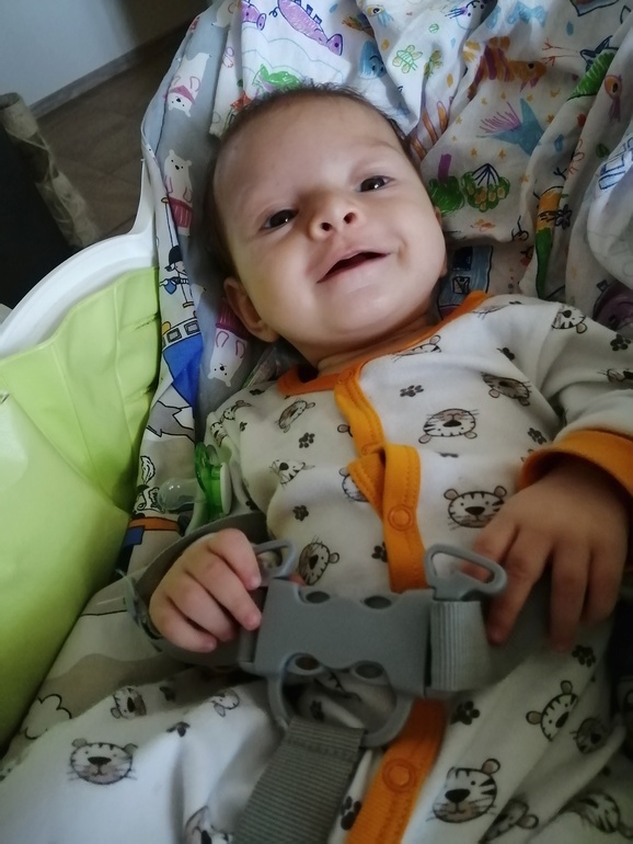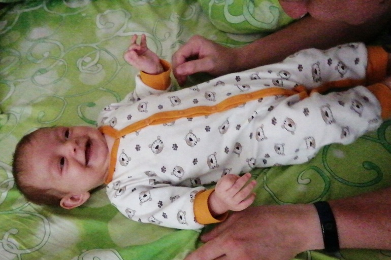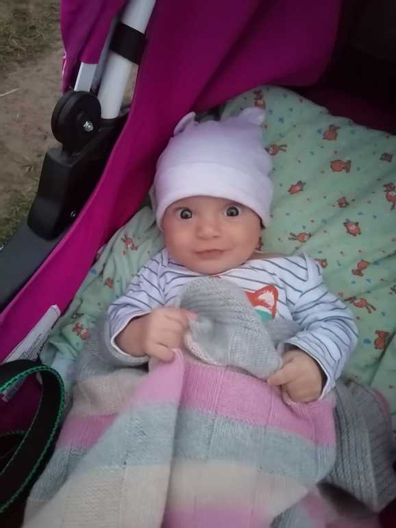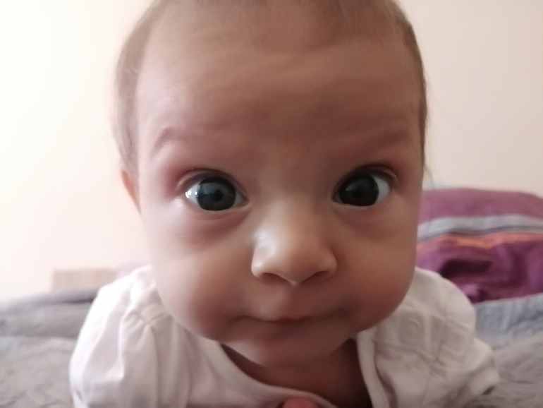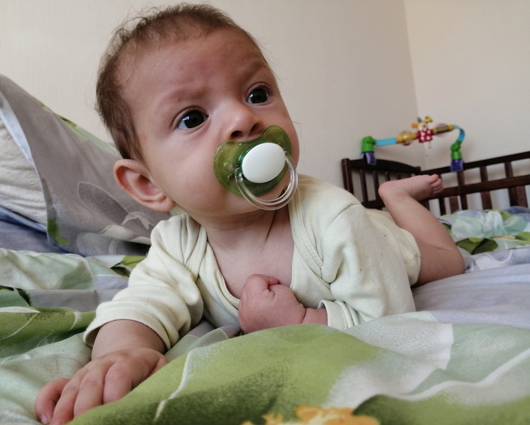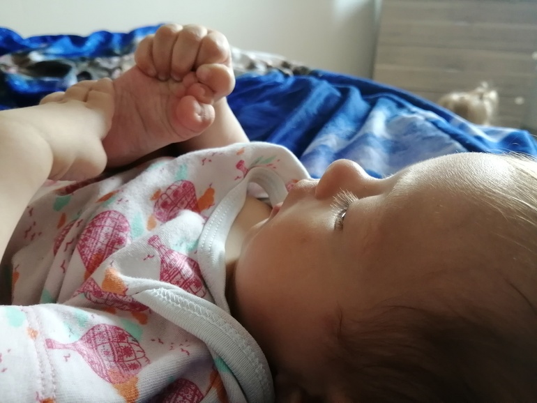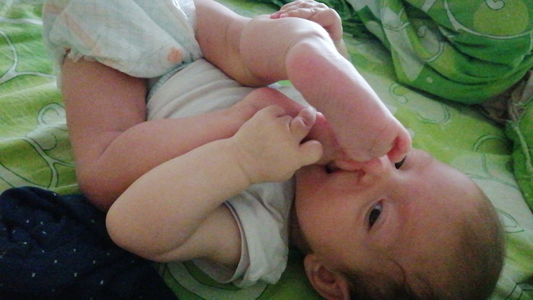 Вертится, лежит на животе уже без психов. Смеётся в голос (голос, кстати, очень забавный). Любит сосать свои руки, одежду, ноги, иногда пустышку. Причём ей сначала в руках надо её повертеть, выбрать, с какого конца грызть 😆