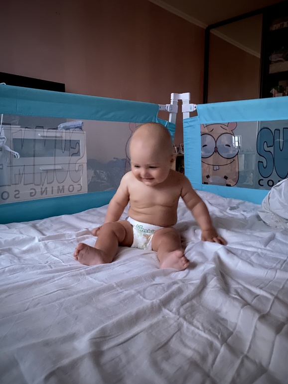 Сейчас малой научился ползать, причем довольно резво. Сегодня утром впервые поймала его у своих ступней уже, когда он, проползая мимо моих ног к краю кровати, решил меня укусить 🙈