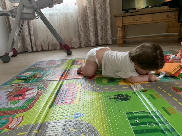 Она уже сбегает, колбаской перекатывается шустро 😀 и задом ползает. Караулю, полы холодные, мы сейчас за городом, либо на плитке коврик, либо на бетоне на улице. Следим, чтобы не сбегала🧐