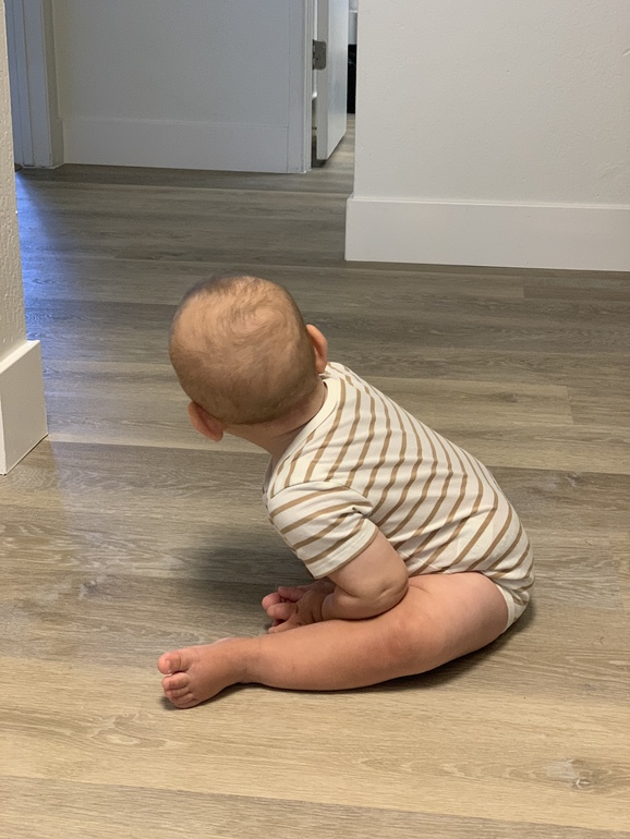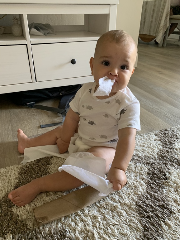 Заметила, что в прошедший месяц у него больше изменения не в физическом, к в психо-эмоциональном плане. Может сидеть наблюдать за чем-то, как это работает. Или, например, сосредоточенно вкладывает игрушку в одной руке в игрушку в другой. Заглядывает под кровати/комоды/шкафы с целью что-то достать. Соображает, что, если с этой стороны не получается, то нужно подползти с другой стороны, и тогда дотянешься.