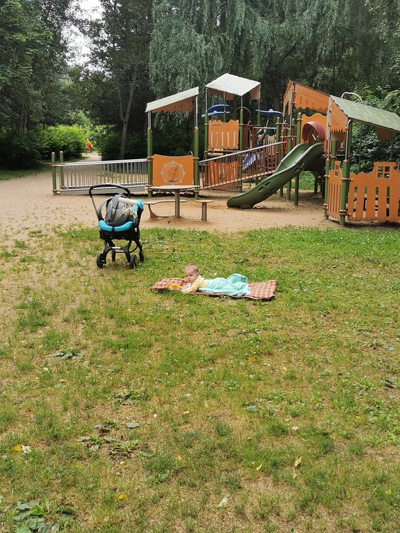 Глебчик лежал себе спокойно в коляске, пока я со старшим изучала детские площадки. Прекрасное место, советую всем москвичам и около съездить🌳