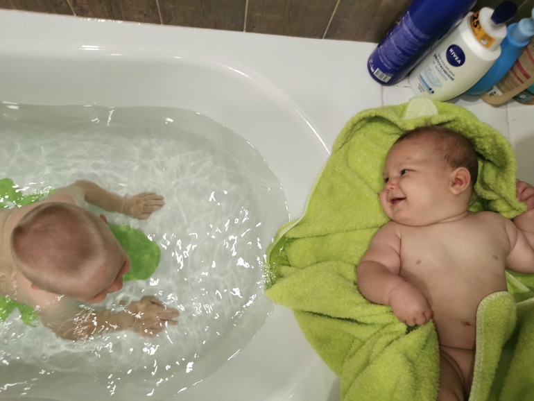 Недавно появилась новая фишка в ванне, которая меня откровенно напрягает: Глебчик специально закидывет голову назад так, чтобы она ушла под воду. И ржет. Казалось: что ты, мать, переживаешь, он же в круге. А вот волнуюсь. Он так сильно выгибается, что получается опустить голову в воду аж до лба. А потом, когда возвращается на исходную позицию, черпает воду. Много. По нос точно. Она не сразу уходит. Вот и переживаю: то ли нырнет, то ли на выходе нахлебается. Короче, надо менять способ купания 🤔