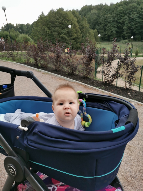 В коляске в основном на животе стал тусить. И раньше на животе много гулял, но тогда ещё обзор был плохой, а сейчас подрос, крутит головой во все стороны. Прохожие ржут над нами, а бабульки так сразу причетают и хотят перевернуть 😁