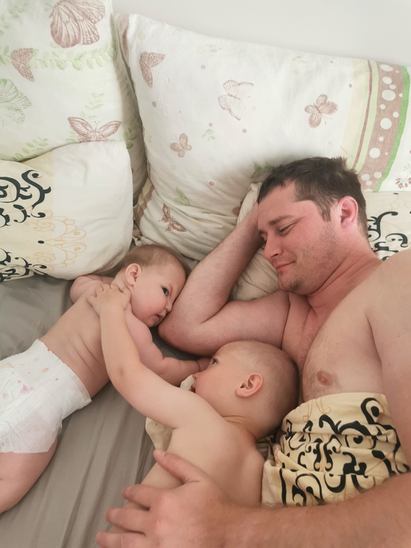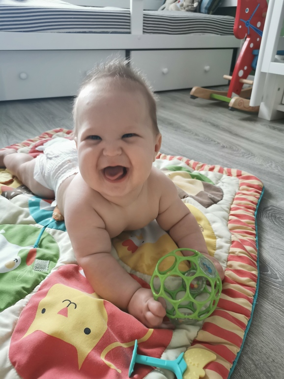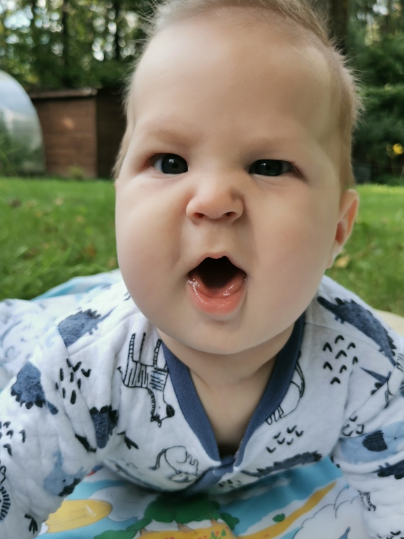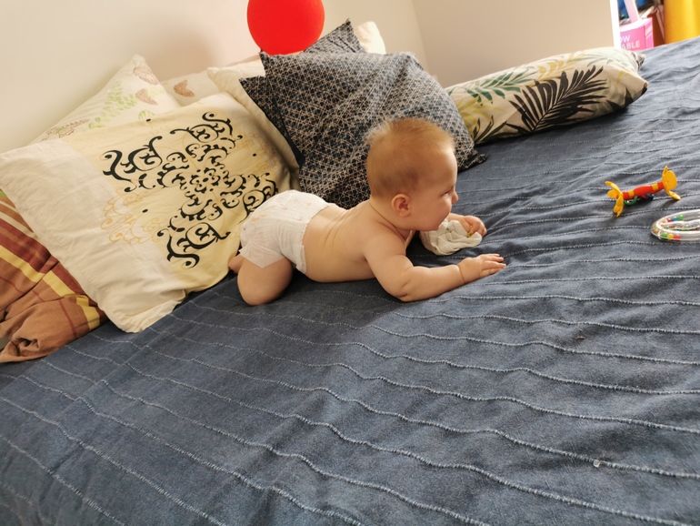 Но я пропустила этот первый переворот 🙈 Ждала его, как праздника. Все переживала, волновалась уже (в нормах то до 6 месяцев переворот). И пропустила 🤦🏼♀️ Нам надо было выходить за Львом в сад, а младшему срочно потребовалось сначала в туалет (продолжаю высаживать, 90% он ходит по большому именно так, и требует этого), а потом срочно наесть обратно скинутый баласт 😁 В общем, покормила, положила в кроватку на спину (поел же только), головой к мобилю (точнее уже к оставшемуся от мобиля бум-боксу), включила и убежала одеваться. Прихожу, а он на животе и ржёт 😆