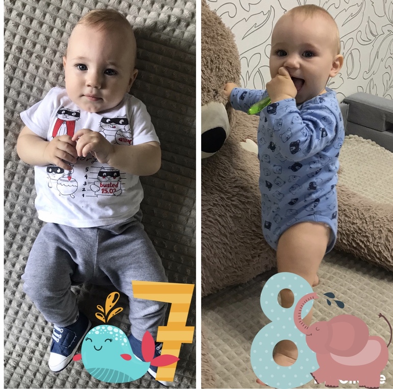 Отчёты по месяцамВремя притормози чуть-чуть. 📏 👣Рост 71 ,вес 9300🙄. За четыре месяца последних прибавка всего 1,3кг . Новых умелок особо не появилось ,программа максимум была выполнена в 7 месяцев,осталось только пойти .😊 стал маленько играть с игрушками а не только их облизывать и слюнявить . Характер дай Боже мой🤪че не по его ,психует, дергается и орет так что соседи думают ,что я его убиваю наверное . Папа говорит характером в маму ,ну ну 😐. Болтает сам с собой,смеётся так прикольно ,как то нежно. Наконец-то перешли на два сна,как я этого ждала,хоть ВБ увеличилось ,можно поделать какие-то дела. С сынком я 24/7 бабушки ,дедушки далеко. За 8 месяцев не разлучались дольше чем на его сон .Если ухожу из комнаты на кухню,сын начинает реветь при виде моей удаляющейся спины. Нытьё конечно раздражает иногда психую на него,но все мы люди человеки . Так же если тусим на кухне ,не любит когда я долго стою у раковины начинает ныть и обнимать ноги . Как написала тут девушка,спина мамы не считается за ее присутствие . Стал прижиматься так и голову ложить на грудь или плечо,это так мило 😍готова его так обнять сильно на сколько можно,но так сильно нельзя. С прикормом не понятно ,ест по малу и не все . Лезет пятый зуб,боковой резец,тьфу,тьфу,тьфу с этим проблем нет .Хочется чтоб ел,первое,второе и компот ,ведь он такой шилопоп,столько энергии теряет.