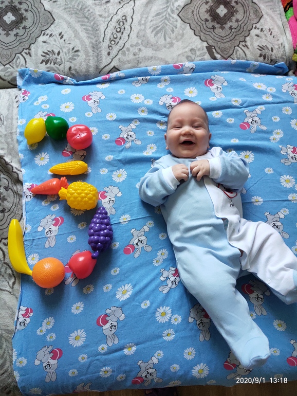 Досуг: пока готовлю лежит рядом, в стульчике-шезлонге для кормления. Если надоест, перекладываю на развивающий коврик, там висят игрушки. Начнет возмущаться - переверну на живот. Крутится вокруг своей оси. Положу прямо, крутанется поперек!)) Сидит в шезлонге Фишер прайс, смотрит мультики. Сам себя качает)) Гулит, улыбается, интересуется игрушками, тянется, пытается взять.