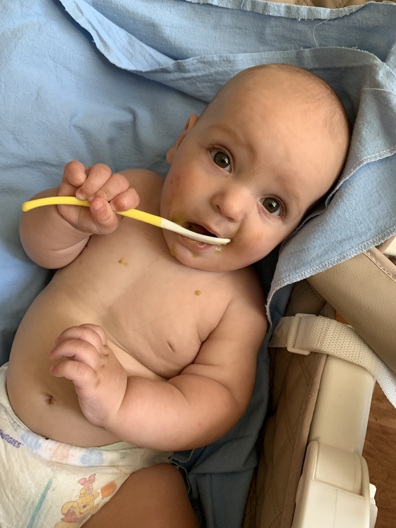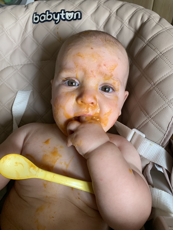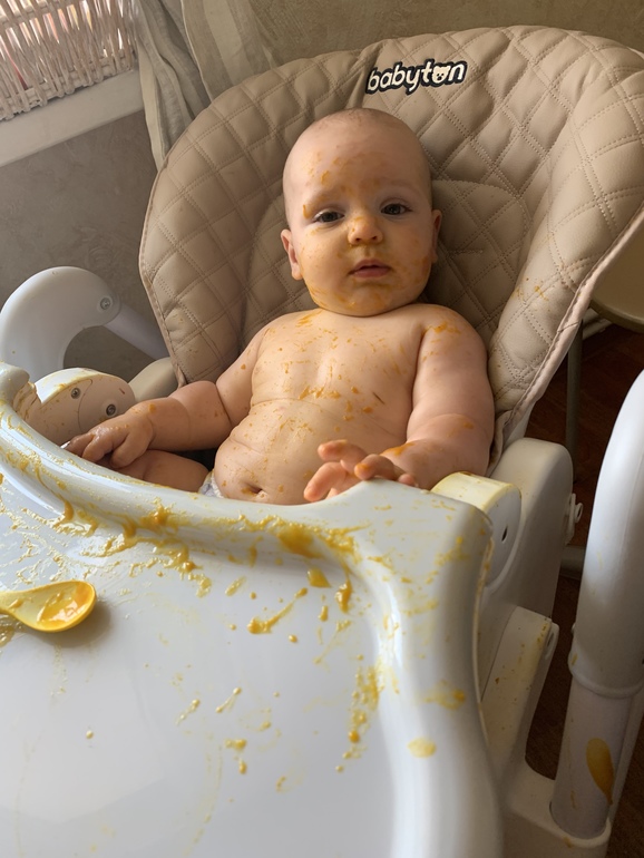 В 5.5 месяцев предложила брокколи. Думаю, не захочет, уберу до 6 месяцев. Серега схватил ложку и в рот (ясное дело, рефлекс). Думала убрать, кричит. Даю ещё, хватает и в рот. И только с ложки, руками не, зато весь в этой пюрехе. Ест только сам. После еды замачиваю ребёнка в ванной целиком 🤪
