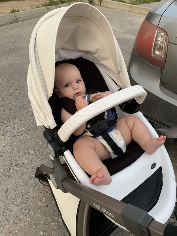 - В стуле и в коляске находится под 45•, поэтому постоянно пытается на руках подтянуться и сесть. После финта с русалом меня это стало меньше волновать.