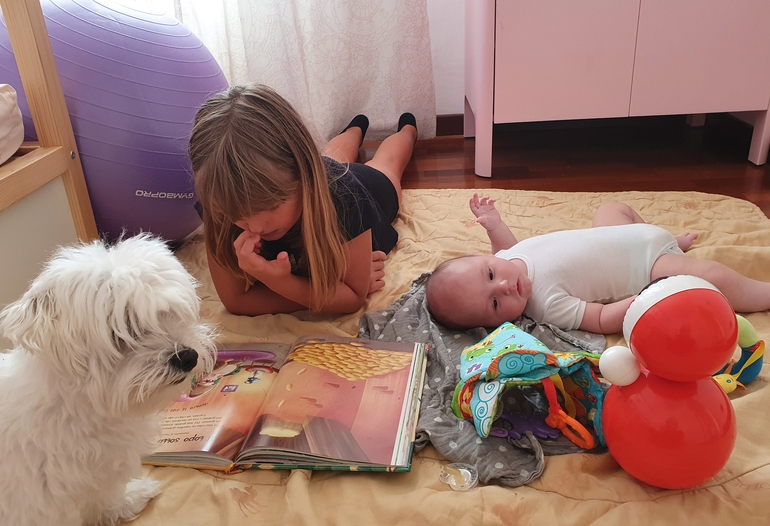 🙂 Много болтает, с выражением, особенно по утрам, пока мама еще спит, кому- то что-то громко объясняет.