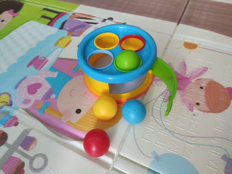 Любимая игрушка барабан с дырками для разноцветных шариков и легкий фетиш в тяжелой форме - это, собственно, шарики и все шарообразное. Купила ему даже набор шариков с разной текстурой. Гоняет, подгребает под себя и жадничает. Недавно вариацией шариков стали еще и луковицы:)