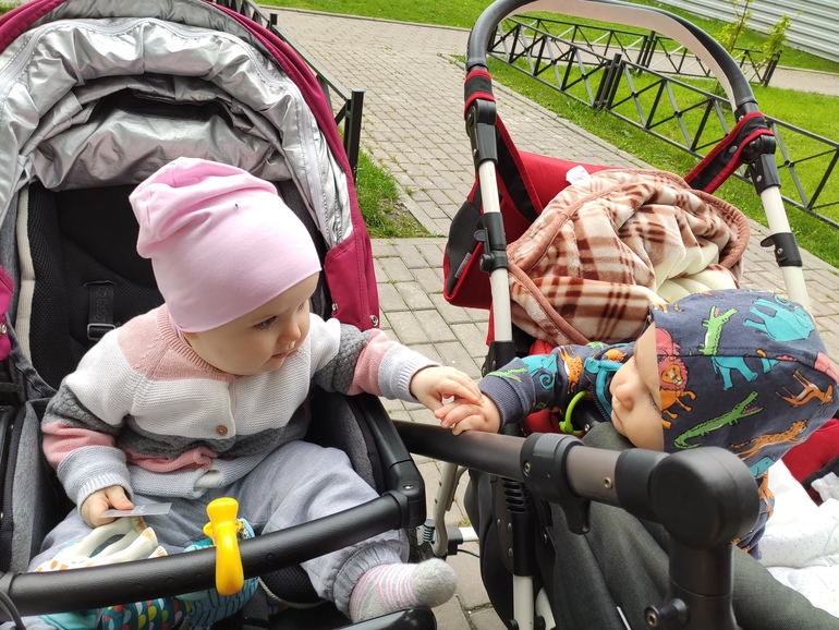 Особая любовь у него к девочкам. Когда видит нашу подругу Аврору, едва не выпрыгивает из коляски. Как итог, на следующей неделе собираемся в гости начинать половую жизнь от слова "пол" :)) Они болтают, тянут друг к другу ручки....милотааа *__*