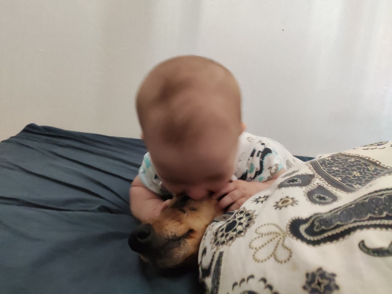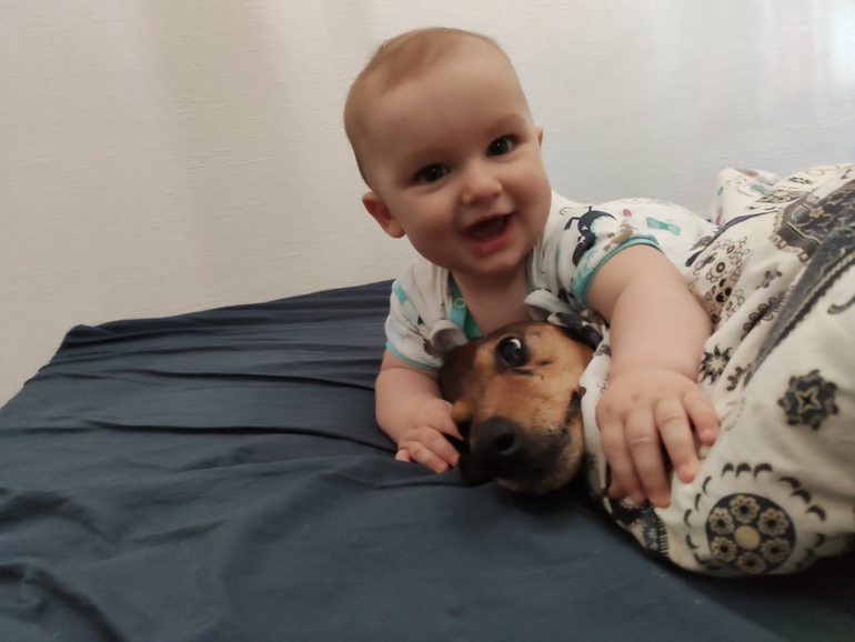 Собачья жизнь таксо-няни с момента как МихалСаныч пополз, стала веселее. Особенно, когда любвеобильный тип настигает её внезапно и кусает :) А недавно еще и на место её уселся. Так что теперь в доме активная конкуренция.