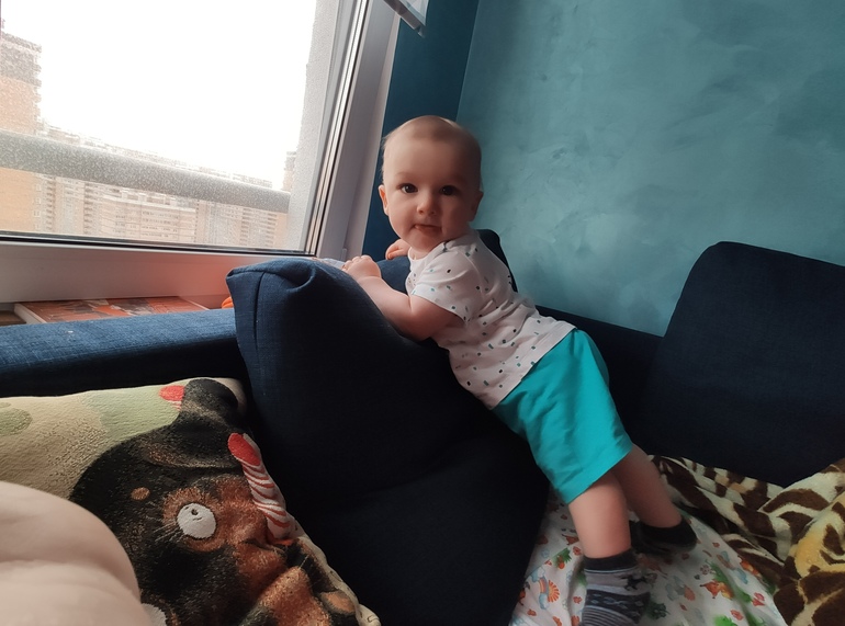 Из совсем нового, начал попытки встать на ноги у опоры. Пока получается легко встать на колени, а на сами ноги только если карабкается по подушке.