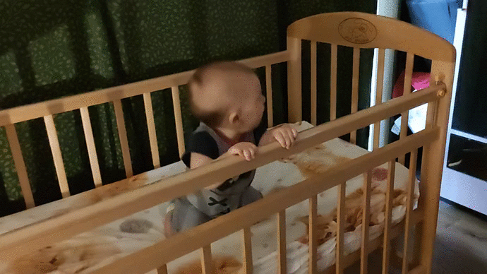 А недавно освоил вставание на коленки и просто...скачет, раскачивая кроватку туда-сюда)))