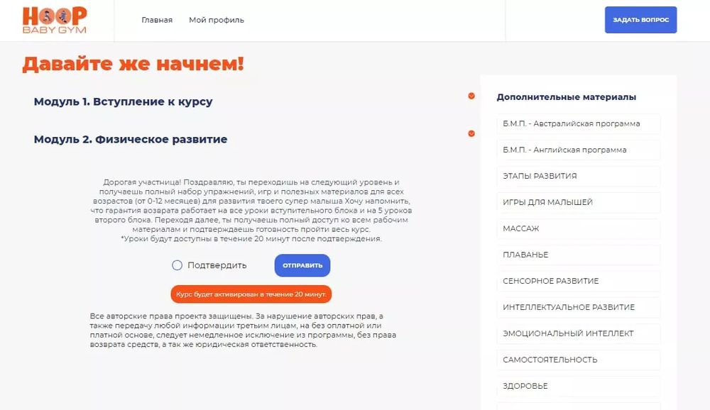 Мне, не понравился курс. Очень навязчивый менеджер по продажам, зато после покупки полный игнор тех.поддержки. Возврат невозможен, всегда будет веская причина на это. Много воды, материал подан хаотично, информация из раздела в раздел повторяется. Некоторые упражнения вызывают сомнения со стороны их безопасности. Материалов очень много, которые можно было подать коротко и ясно. Это забирает очень много времени, а толку мало. Не ко всем разделам есть конспекты, которые можно скачать и подглядывать. Например, раздел «массаж и гимнастика». Цена очень завышена за такой продукт, ожидания не оправдались.