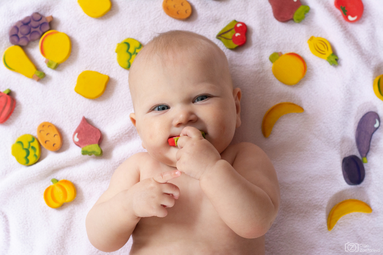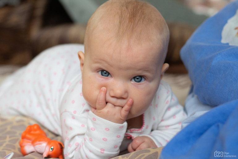 Кстати, ближе к шести месяцам Милада стала играть более активно и как бы на другом уровне: перекладывает из руки в руку, сосёт, потом ощупывает, снова подносит ко рту, лупит ею по полу.
