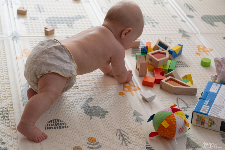 За три дня до полугода я заметила, что Милада, наконец, использует стойку на четвереньках осознанно, для перемещения в пространстве. Прежде только вокруг пупка активно крутилась целенаправленно, а месяц на четвереньках провела, получается, просто как для тренировки. Теперь согнёт ножки, выпрямится - и уже на 10см ближе к желаемому предмету. Ожидаю в связи с этим более быстрых перемещений по полу по принципу гусеницы землемера :), а потом и нормального ползанья.