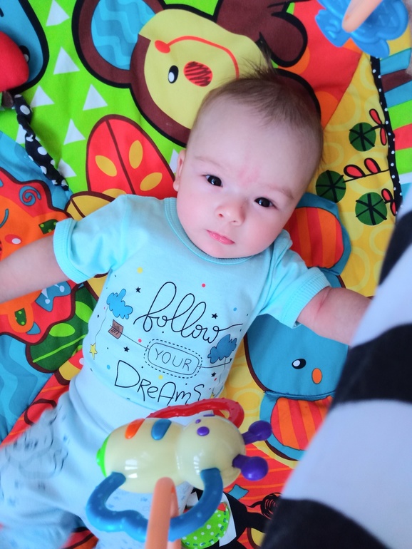 -ребёночек не ручной. На руках ему быстро надоедает. На полу лежать тоже не любит. Немного полежит и давай орать. Я уж думаю, ну как же так, ну надо же ему учиться переворачиваться, на полу это лучше чем на кровати. А он вот орёт на полу и все тут. И на коврике, и без коврика.