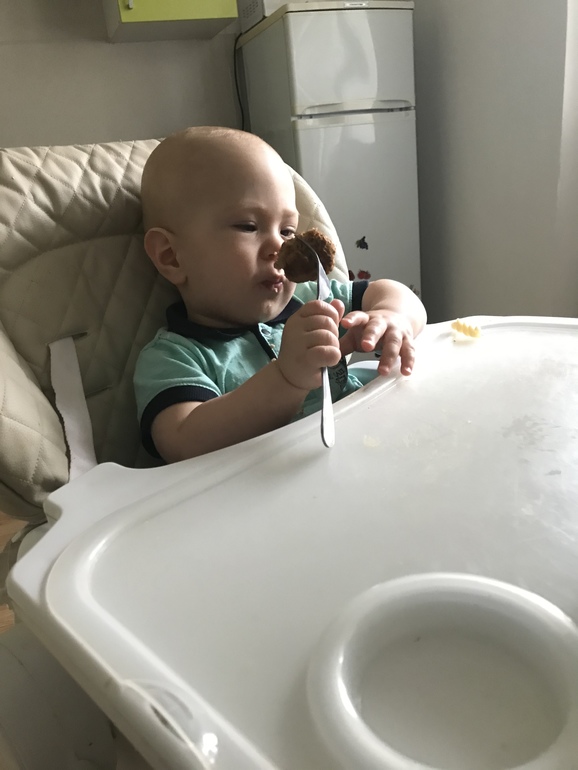 Это он у папы забрал тефтелю прям на вилке 😂 А так с приборами пока не дружит. Ну вот наколотое на вилку да, ест