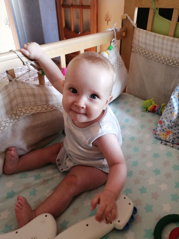 Показал мне, что может ползать на четвереньках, но по привычке плюхается на живот и улепетывает. Стал садится и из положения стоя, но сидит все еще придерживаясь 1 рукой. Чаще всего сидит у брата в комнате у контейнера с лего на коленях и выкидывает кубики.