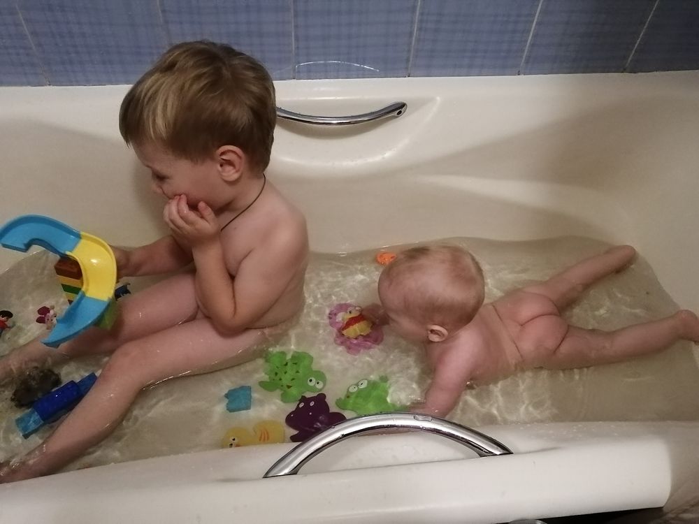 Больше в большой ванне не купаю, встал, подскользнулся и стукнулся затылком. Да и Пете не понравилось с братом мыться, забирает его игрушки))