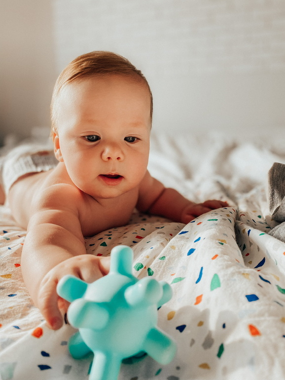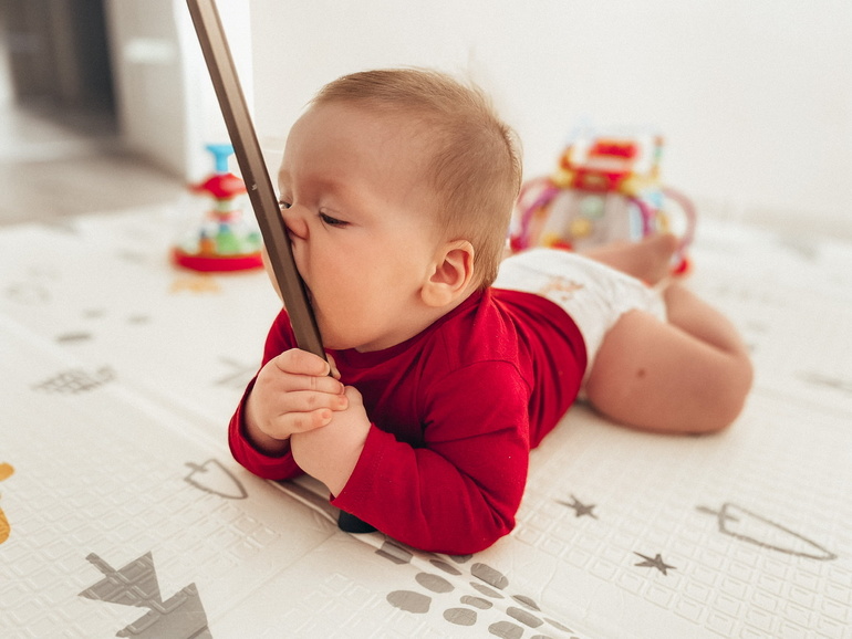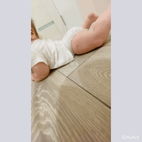 Он очень активен, знает во что, он хочет играть и что конкретно ему для этого надо, так он освоил новый способ передвижения к цели и начал ползать по-пластунски. Ура!