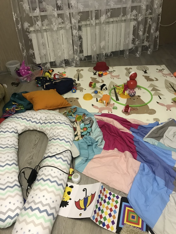 Начинаем день в пустой комнате, а вечером на полу лежит все: игрушки, одежда, пелёнки, кухонные принадлежности, ведра, кастрюли, одеяло, подушки. После ночного сна может сам играть 30-40 минут на коврике. В остальное время требует присутствие родителя. После последнего дневного сна один не играет вообще. Минут 20 из ВБ обычно кушаем. Если надо что-то делать, то сажаю его в стул и кладу на столик всякие лопатки, венчики и прочую пластиковую фигню с кухни. Сидит и лупит по этому столику)) А в 20.00 ложится спать и тогда наступает свобода)) Вот так выглядит комната вечером))