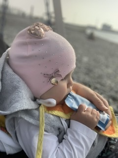 днём и вечером спала в коляске, на пляже ползала, играла с камнями...