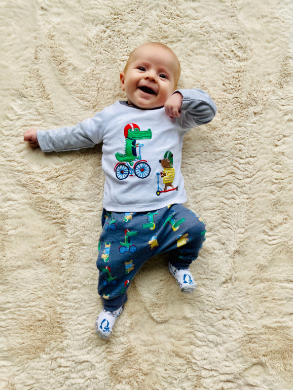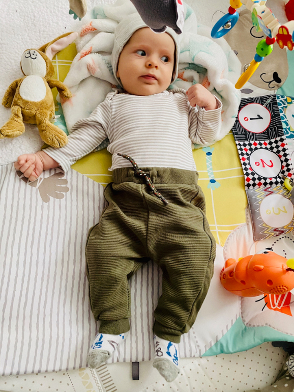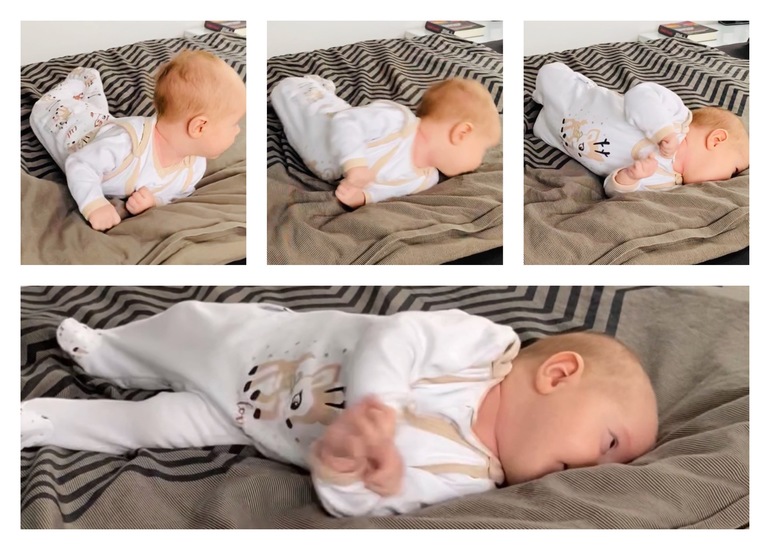 Пока спонтанных, "собственных" переворотов нет, В этот понедельник (2.11.) сделал это впервые во время "тренировки". И в течение этих дней делает, если я или папа ему подбираем ручку в сторону переворота. Вчера я его тоже в правильном положении на кровати смогла научить 1 раз перевернуться на бочок, но потом он снова "забыл" как это делается и устав от тренировки возмущенно пищал)))
