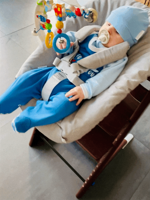 Я это поняла, наблюдая как он взаимодействовал с мобилем на новом высоком стульчике, причем левой рукой. Сегодня "тренировали" правую: