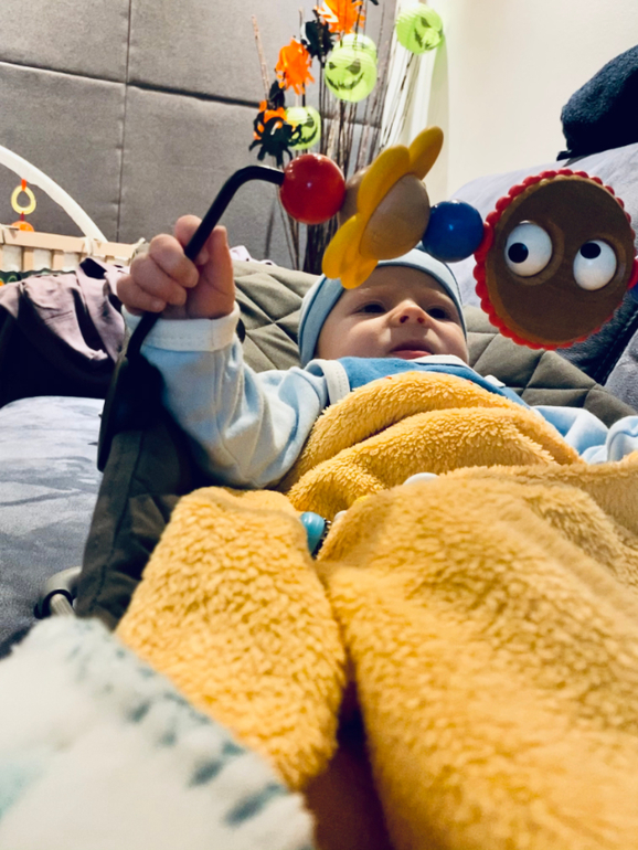 Я долго чертыхалась на этот мобиль, который он упорно игнорировал все 3 месяца так, будто его тут и нет)) А сегодня вот УВИДЕЛ его и каааак давай его крутить-вертеть))))