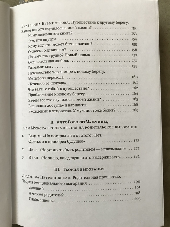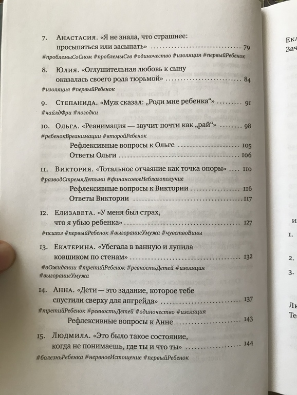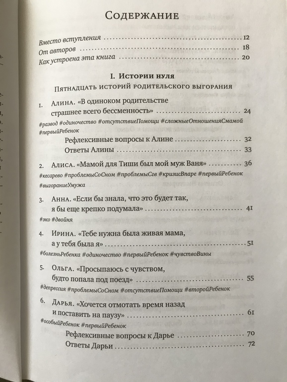 В книге 15 историй о родительстве на фоне эмоционального выгорания - с двойней, с поздним ребёнком, со вторым ребёнком, о воспитании без помощи бабушек и нянь, когда ушёл муж, когда особенный ребёнок.