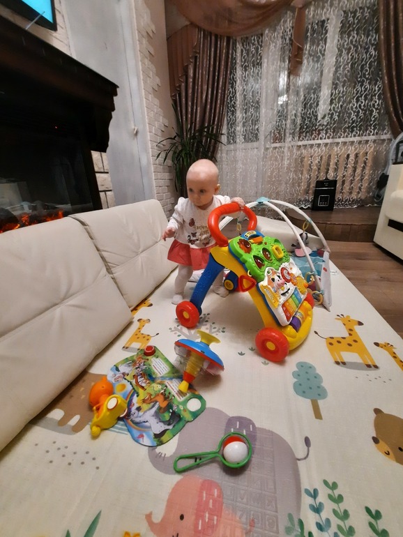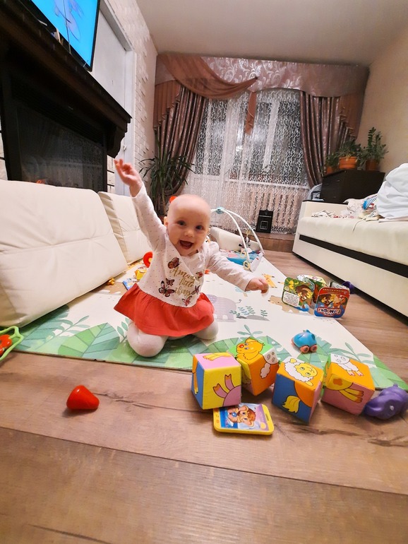 Мы научились махать ручкой " пока-пока" , провожая папу и брата обязательно им машем. Держась за предметы стали ходить, еще медленнл и не уверенно, но у нас все в переди. Несколько раз стояли не держась. Ползаем со скоростью бешенного таракана, очень быстро. Крутим хвост собаке, а так как у нас лезут зубки, то уши собаки искусаны все))) Основное меню это грудь, но всякие кашки и пюрешки едим с аппетитом. А в маминой тарелке "помыть" руки это обязательно. Щипаться и кусаться научились , мама плачет. Стали меньше падать, из позиции стоя аккуратно опускаемся на попу. Зубов пока еще🦷🦷 нижних, верхние ждем уже 2 месяца и все ни как.