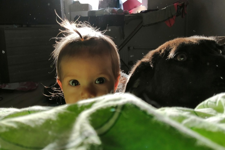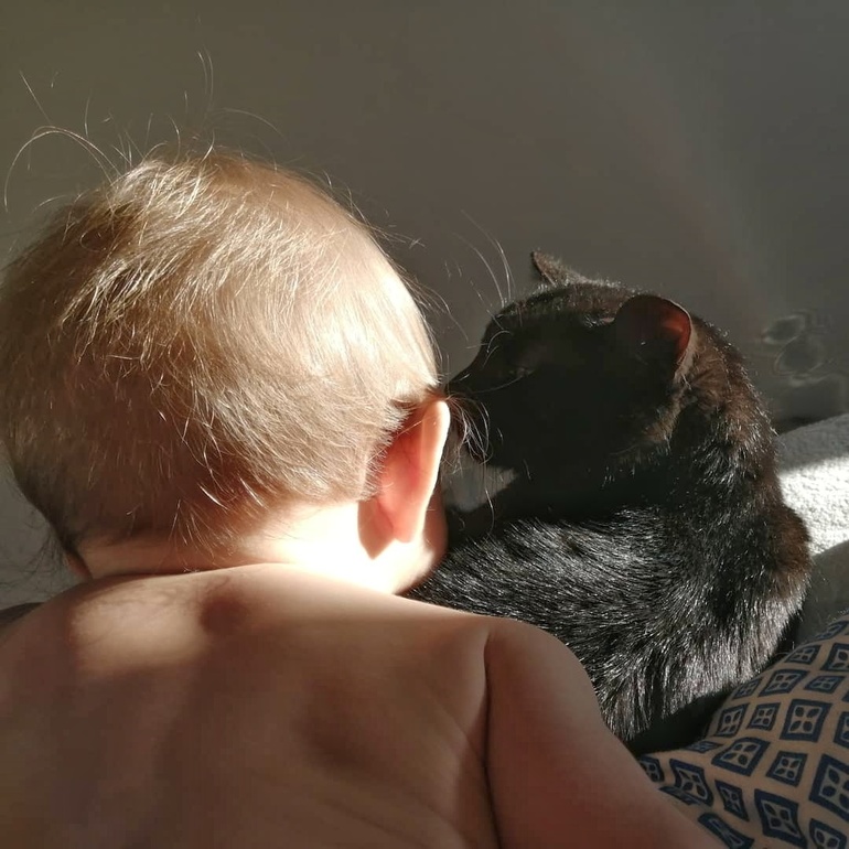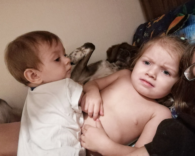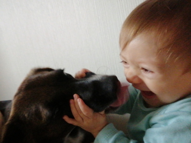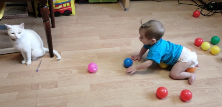 С животными просто любовь. Сейчас они понимают, что Валюха - танк, поэтому предпочитают компанию Катерины) Рэй иногда её роняет, но она всё равно тянется к пушистым.