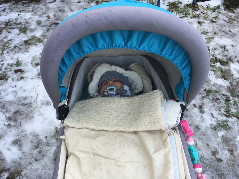 ☂️ Гуляет теперь в коляске, но с условием, что я быстро укачиваю и как только заснёт, то коляску не трогать. Поэтому спит во дворе у бабушки (максимум 3 ч).
