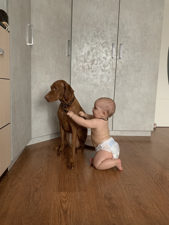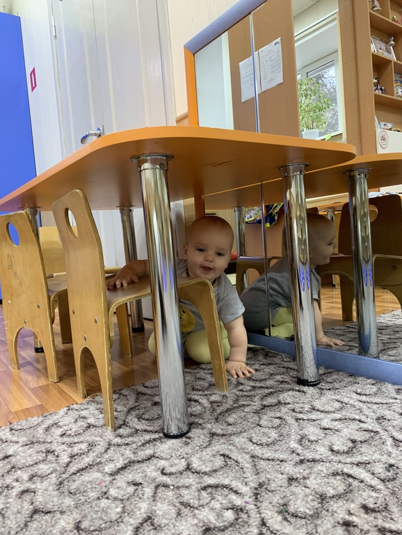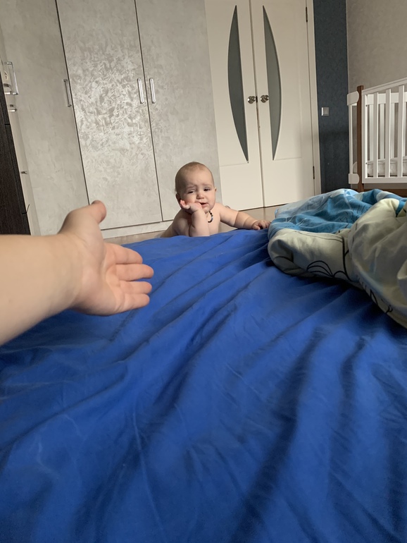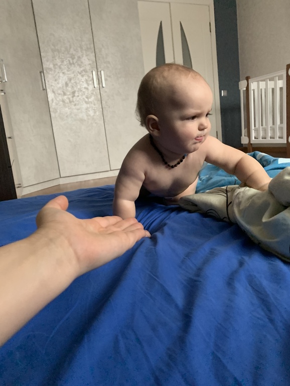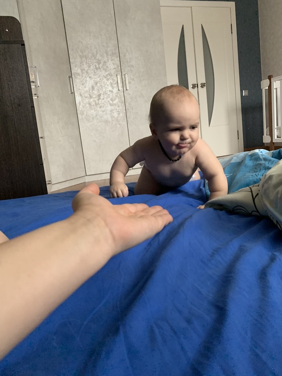 Оценил догонялки с папой на четвереньках. Это так стимулируем к ползанию, потому что чаще он ходит у опоры или стоит. Или возьмётся за стул, его двигает и идёт, опираясь.
