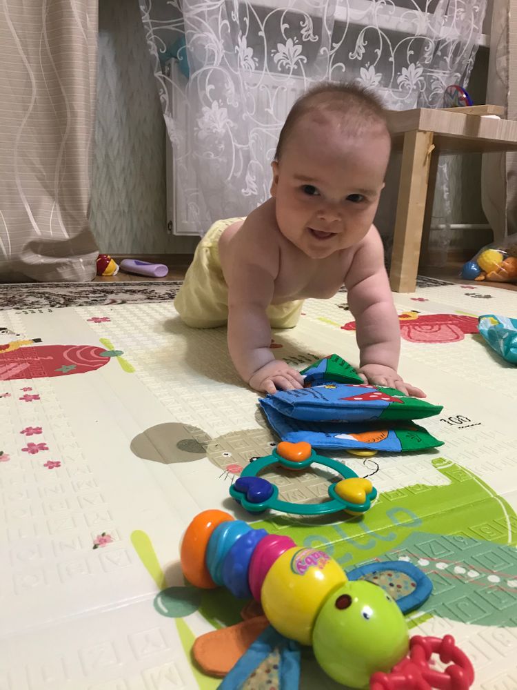Арсенал умелок в 6,5 месяцев добавился переворот с живота на спину, начал кататься колбаской, и буквально через неделю встал на четвереньки и начал раскачиваться. К концу 6 месяца пополз, правда на пузе. Выглядит это так. Встаёт на четвереньки, раскачивается и поддаёт вперёд, плюхается на пузо. Потом снова на четвереньки. Иногда принимает позу упор лёжа, либо асана «собака мордой вниз»☺️. Единственное навыки ползания на дальние расстояния применяет нечасто. Должен быть прям мощный стимул, типа телефона или проводов . В основном барахтается и буксует у себя на коврике. Ровно в 7 месяцев сделали второй пентаксим (гемоглолин 103). Хотели сделать раньше, но ровно в 6 месяцев Тимур заболел, заразился от меня. А я Оказалось переболела ковидом, тк анализ на антитела положительный, обоняние еще до конца не вернулось. Так что 99 процентов Тимур переболел им же. Педиатр сказала рановато пришли (прошло 4 недели), но тк кровь была спокойная допустила. Перенёс прививку хорошо, появилось только уплотнение в месте укола, как и в прошлый раз.
