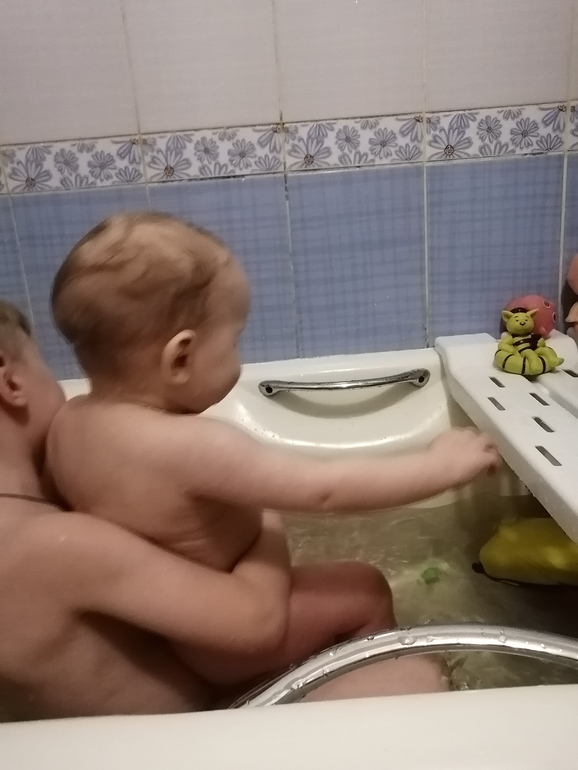 Купаю детей все таки вместе, набираю Ване ванну и Петя тоже сразу хочет купаться, каждый играет в своей половине, если Ваня идёт к петиному столу, то происходит вот что...