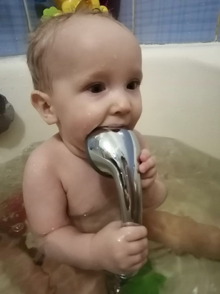 А обычно Ваня грызёт лейку для душа или отрывает игрушки с присосками.