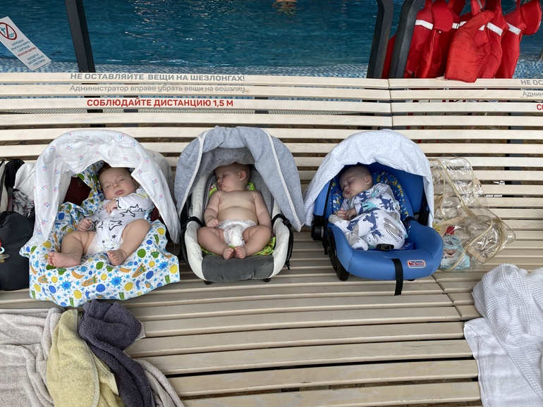 Купаемся мы в малом количестве воды лёжа на животике - моя спина мне дороже😅 стараюсь, конечно, почаще набирать ванну, но она у нас мелкая и кое-кто достаёт ножками до дна и встаёт😂 тем самым увеличивая мне нагрузку на руку. Через некоторое время Я сдаюсь и спускаю воду😂 недавно ходили в Термы с девочками (я брала с собой маму, спасительницу нашу) словили невероятный кайф. Особенно когда детки уснули🤣 Илье понравилось, хотя что делать в воде, где не чувствуешь дна, он не понял. Решила, надо в бассейн сходить к тренеру.