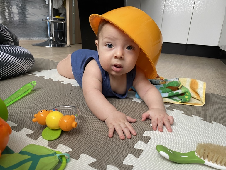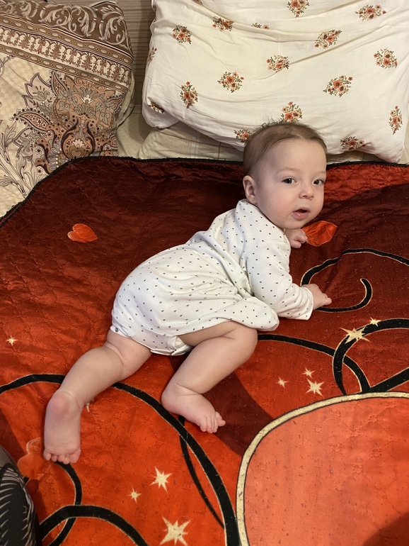 Илья старается ползти. Но пока ручки слабые и что ими делать он не понимает😅 крутится на 360* с легкостью, иногда опирается на одну ручку и смотрит за себя. Думаю, скорее в русалочку сядет, чем поползёт)