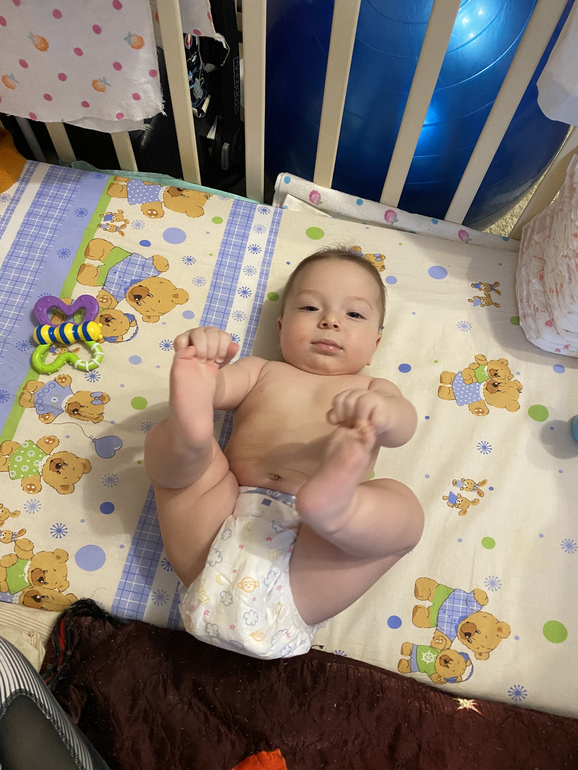 Прошли курс массажа (делала сама), прогресс налицо. После 3 разминочных дней начал брать игрушку ручкой, а не долбить по ней кулачком. После первой разминочной недели снова начал переворачиваться в обе стороны (после некоего прогресса перестал вертеться). После недели полноценного массажа обнаружились ноги.